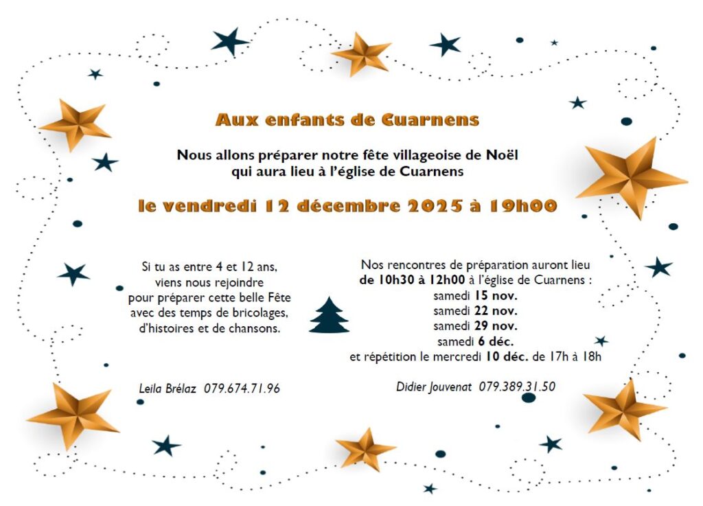 Bienvenue à tous les enfants du village âgés de 4 à 12 ans. La première rencontre de préparation du Noël villageois aura lieu samedi 15 novembre à 10h30 à l’église de Cuarnens.